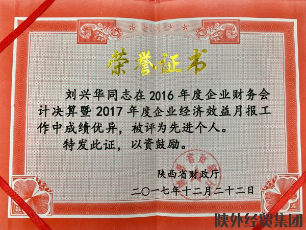 近日,集團公司在陜西省財政廳舉辦的2017年度財務決算布置會上榮獲“陜西省2016年度企業財務會計決算及2017年度企業財務快報工作先進單位”稱號,同時劉興華同志榮獲“陜西省2016年度企業財務會計決算及2017年度企業財務快報工作先進個人”。