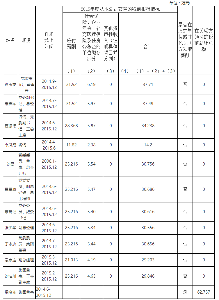 1.上表披露薪酬為我公司負(fù)責(zé)人2015年度全部應(yīng)發(fā)稅前薪酬,按國家規(guī)定由單位繳存各種社會(huì)保險(xiǎn)等。其中,第(1)項(xiàng)由國資委(薪酬審核部門)核定。
