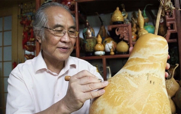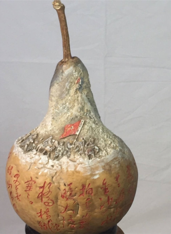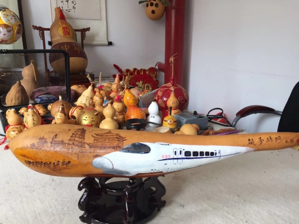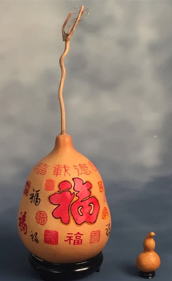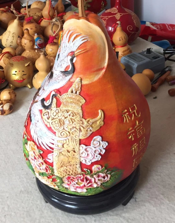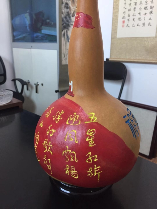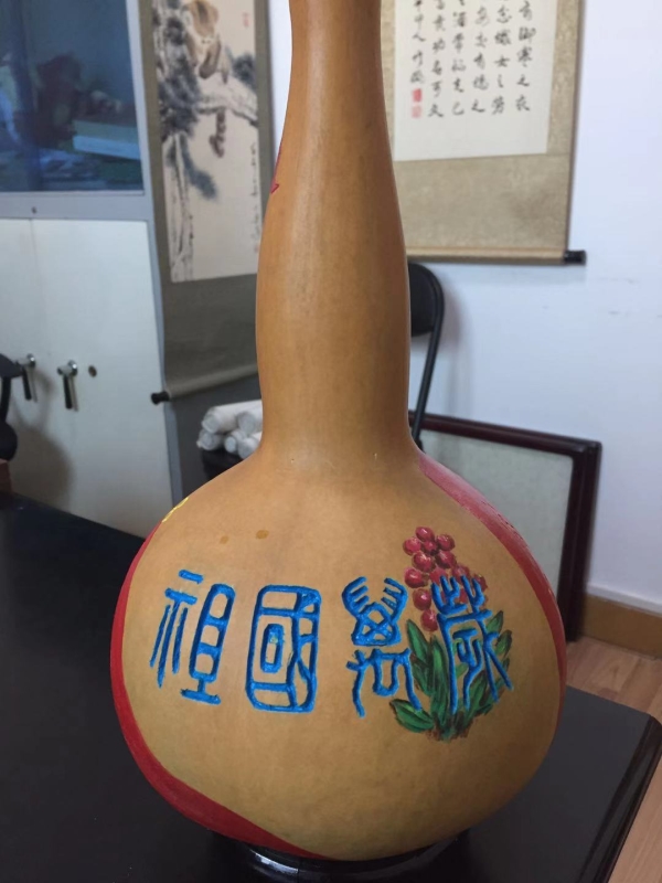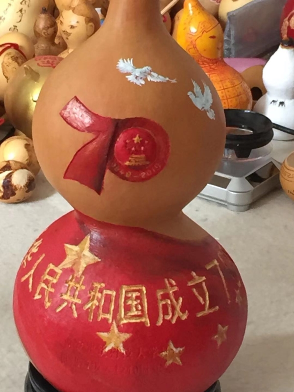 在喜迎新中國成立70周年日子里,梁平安把對祖國的祝福在葫蘆上表現(xiàn)出來,祝祖國繁榮富強(qiáng),人民幸福安康。